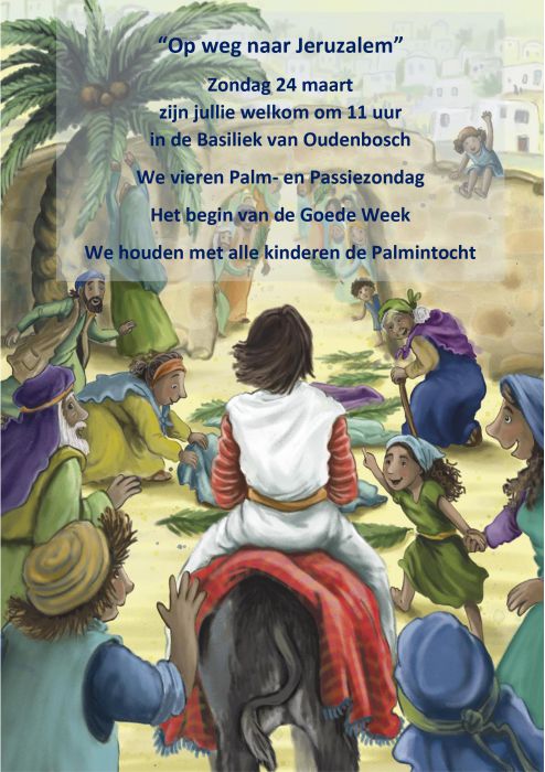 Op zondag 24 maart vieren we om 11.00 uur in de Basiliek van Oudenbosch Palmzondag, de intocht van Jezus in Jeruzalem. Het is de start van een heel bijzondere week: “De Goede Week”, de laatste etappe naar Pasen. Met alle kinderen houden we aan het begin van de viering een Palmprocessie door de Basiliek en gaan daarna in de crypte het verhaal van de Goede Week en Pasen verder verwerken tijdens de kindernevendienst.