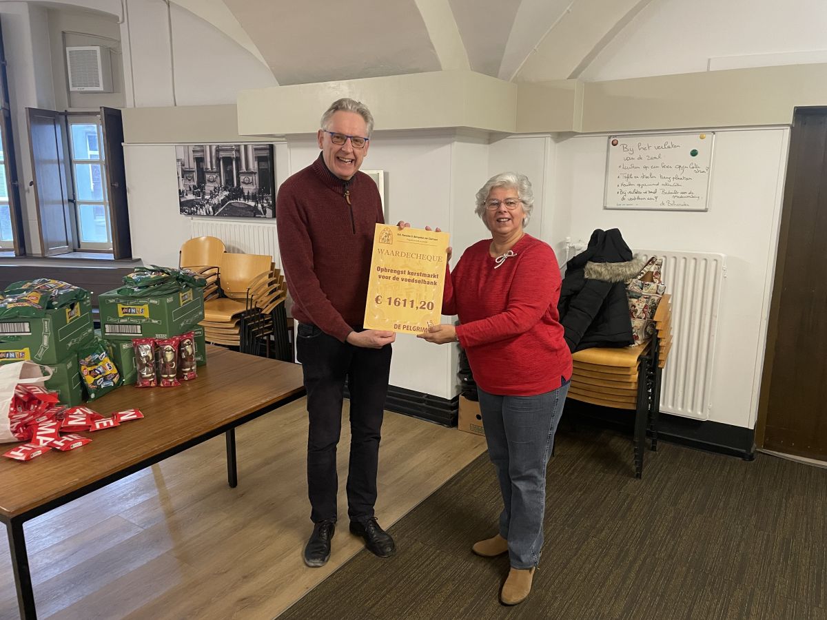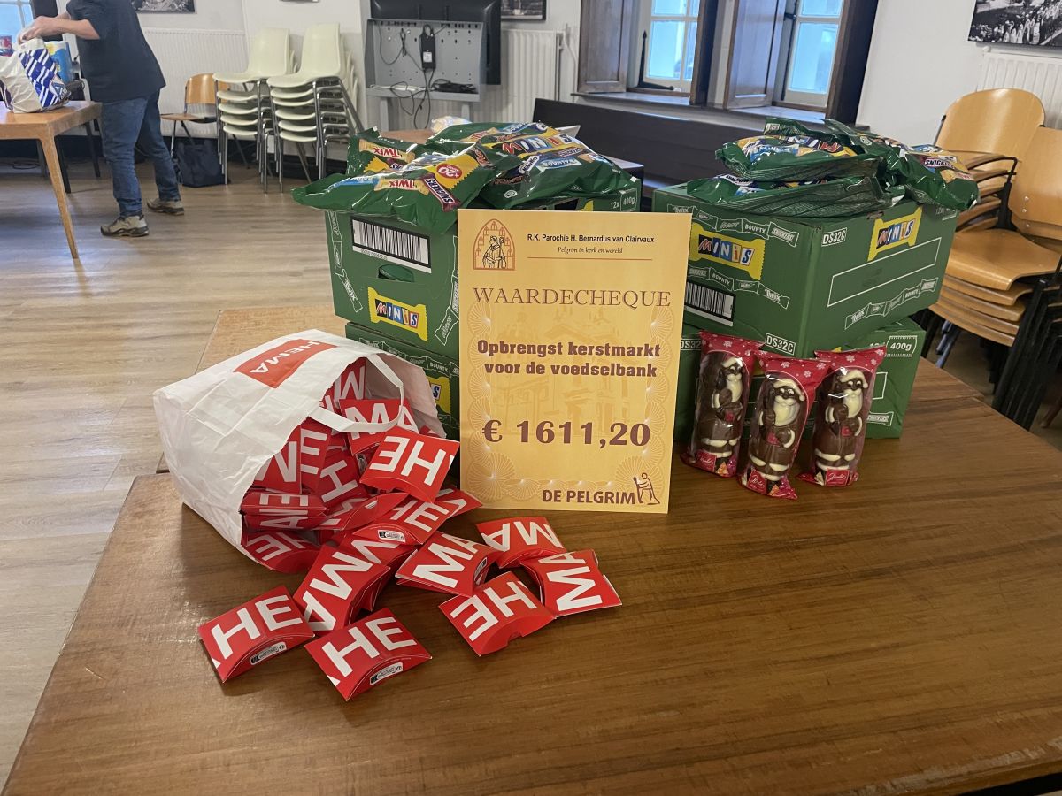 De opbrengst hiervan was bedoeld om een kerstattentie in de vorm van chocolade, te kunnen kopen voor de kinderen uit de gezinnen die afhankelijk zijn van de voedselbank. Niet alleen het aantal bezoekers was boven verwachting, maar ook de opbrengst. We hebben een cheque kunnen overhandigen ter waarde van € 1611,20! Hierdoor kon niet alleen voor chocolade worden gezorgd, maar ook nog voor een cadeaubon.