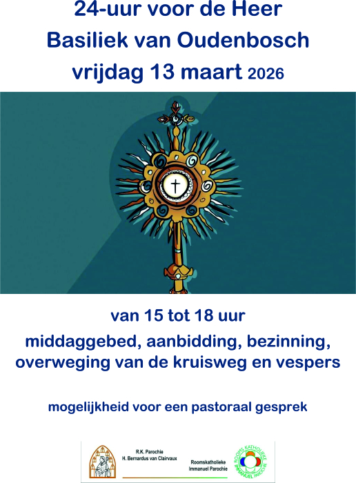 Als Immanuel- en H. Bernardusparochie nemen we ook deel en wel op vrijdag 13 maart van 15.00 tot 18.00 uur in de Basiliek van Oudenbosch. We zullen het Heilig Sacrament vanuit het tabernakel op het altaar plaatsen en het aanbidden, verder zingen we het middaggebed, overwegen we de kruisweg van de Heer en sluiten af met de gezongen vespers.