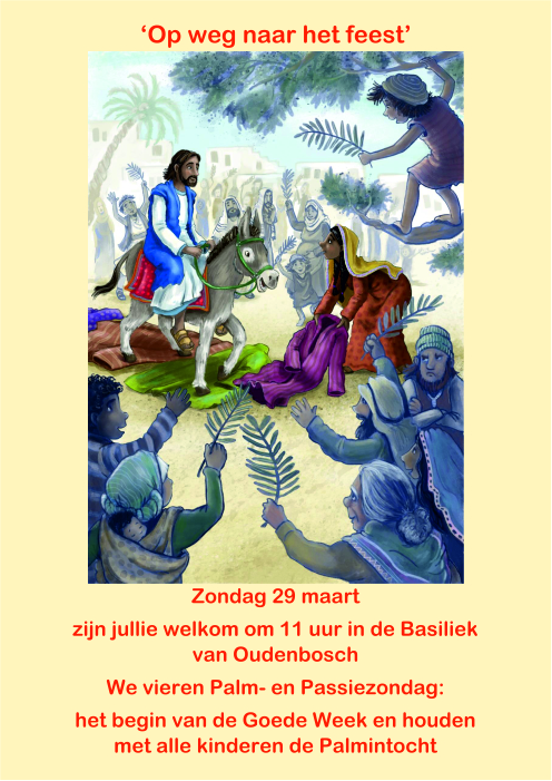 Op zondag 29 maart vieren we om 11.00 uur in de Basiliek van Oudenbosch Palmzondag, de intocht van Jezus in Jeruzalem. Het is de start van een heel bijzondere week: “De Goede Week”, de laatste etappe naar Pasen. Met alle kinderen houden we aan het begin van de viering een Palmprocessie door de Basiliek en gaan daarna in de crypte het verhaal van de Goede Week en Pasen verder verwerken tijdens de kindernevendienst.