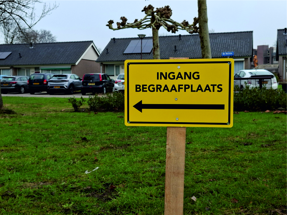 De toegang naar de begraafplaats is mede door de bouwwerkzaamheden achter het kerkgebouw verplaatst.
